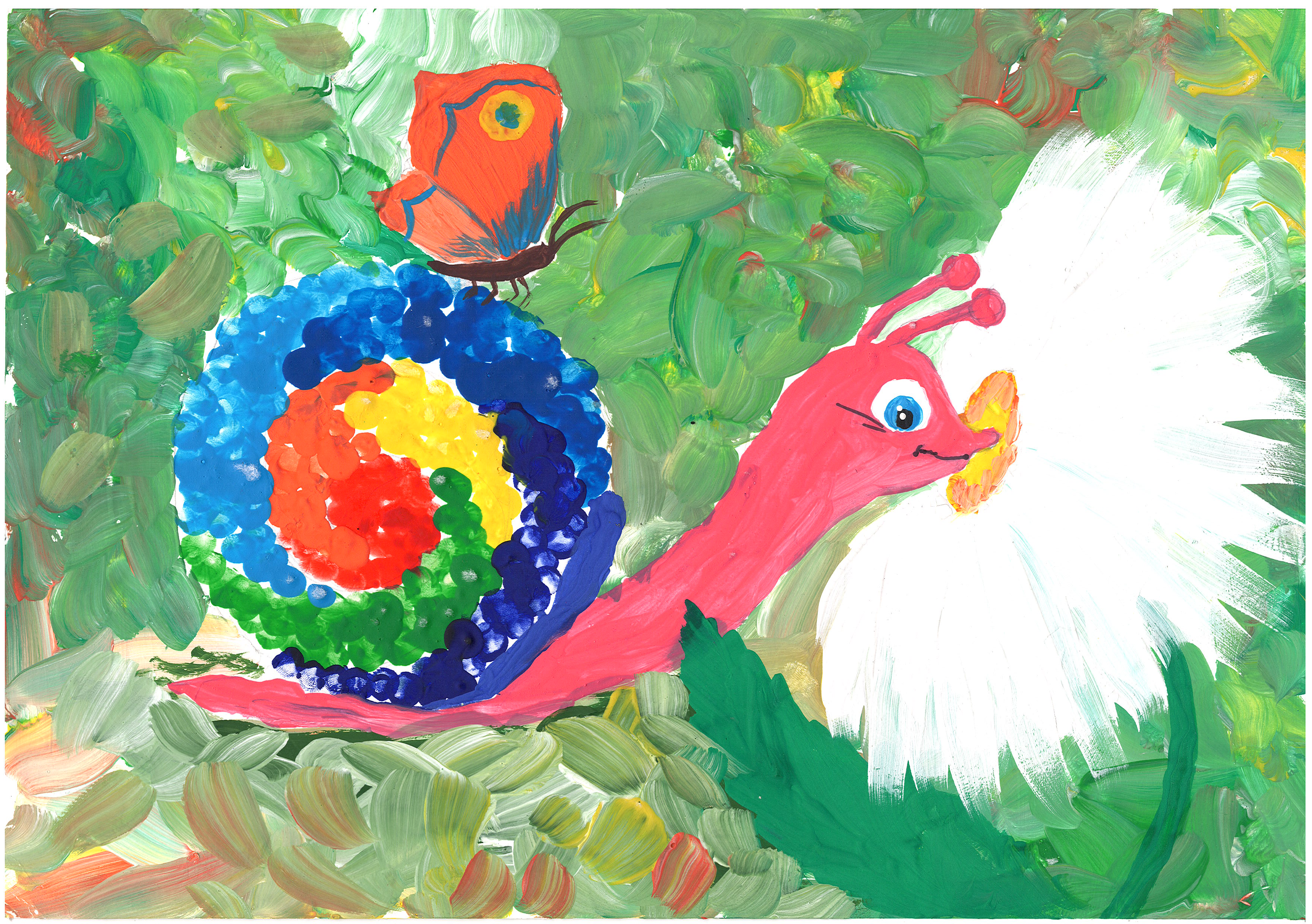 Работа выполнена с помощью мамы, рука в руке, правополушарного рисования. На листе А; гуашью ракушка улиточки нарисована отпечатками пальчиков.