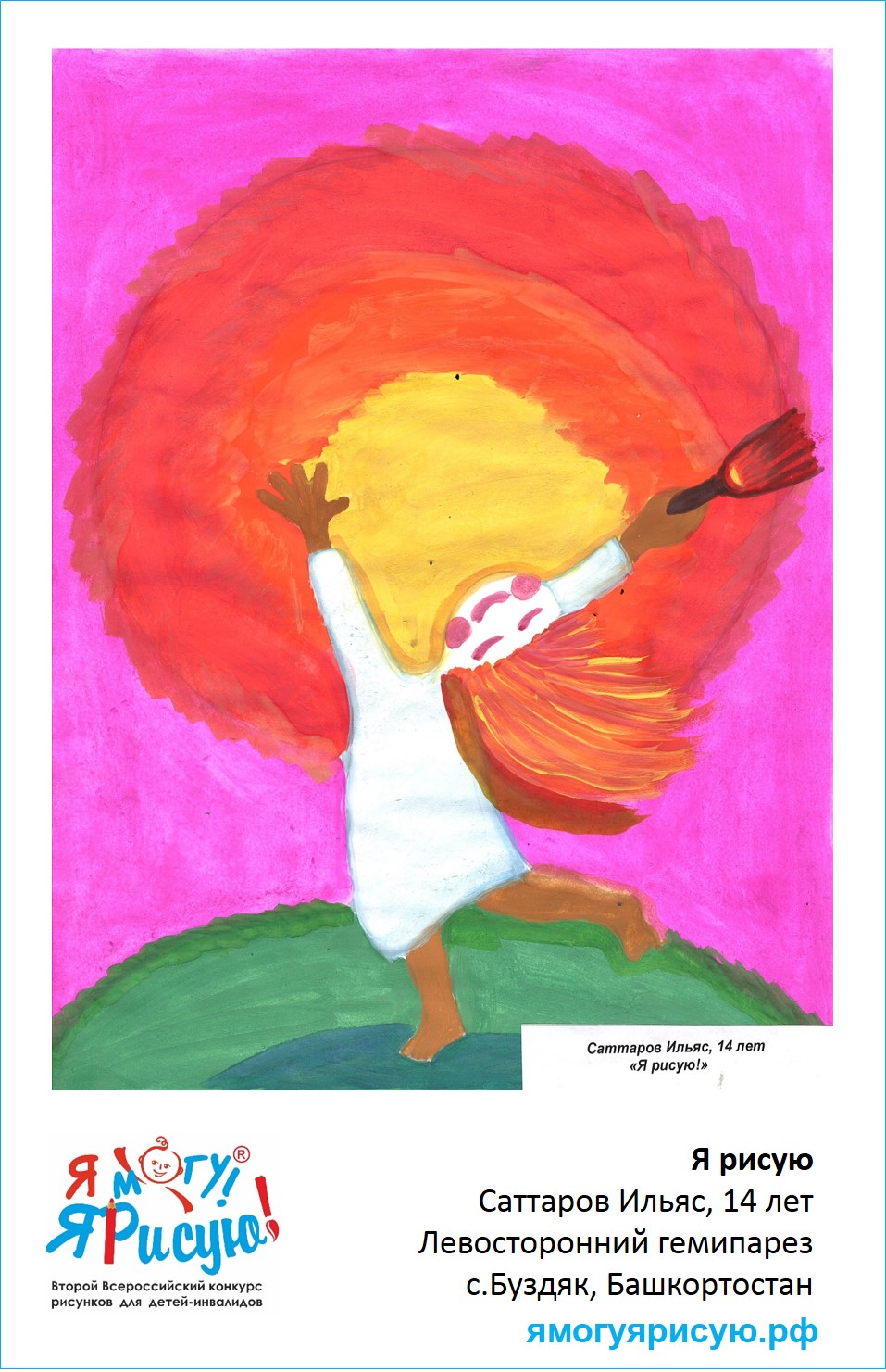 "Работа выполнена в технике гуашь, создание этого рисунка подтолкнула мысль о том,что если есть желание можно добиться всего,если даже есть у человека ограничения здоровья".