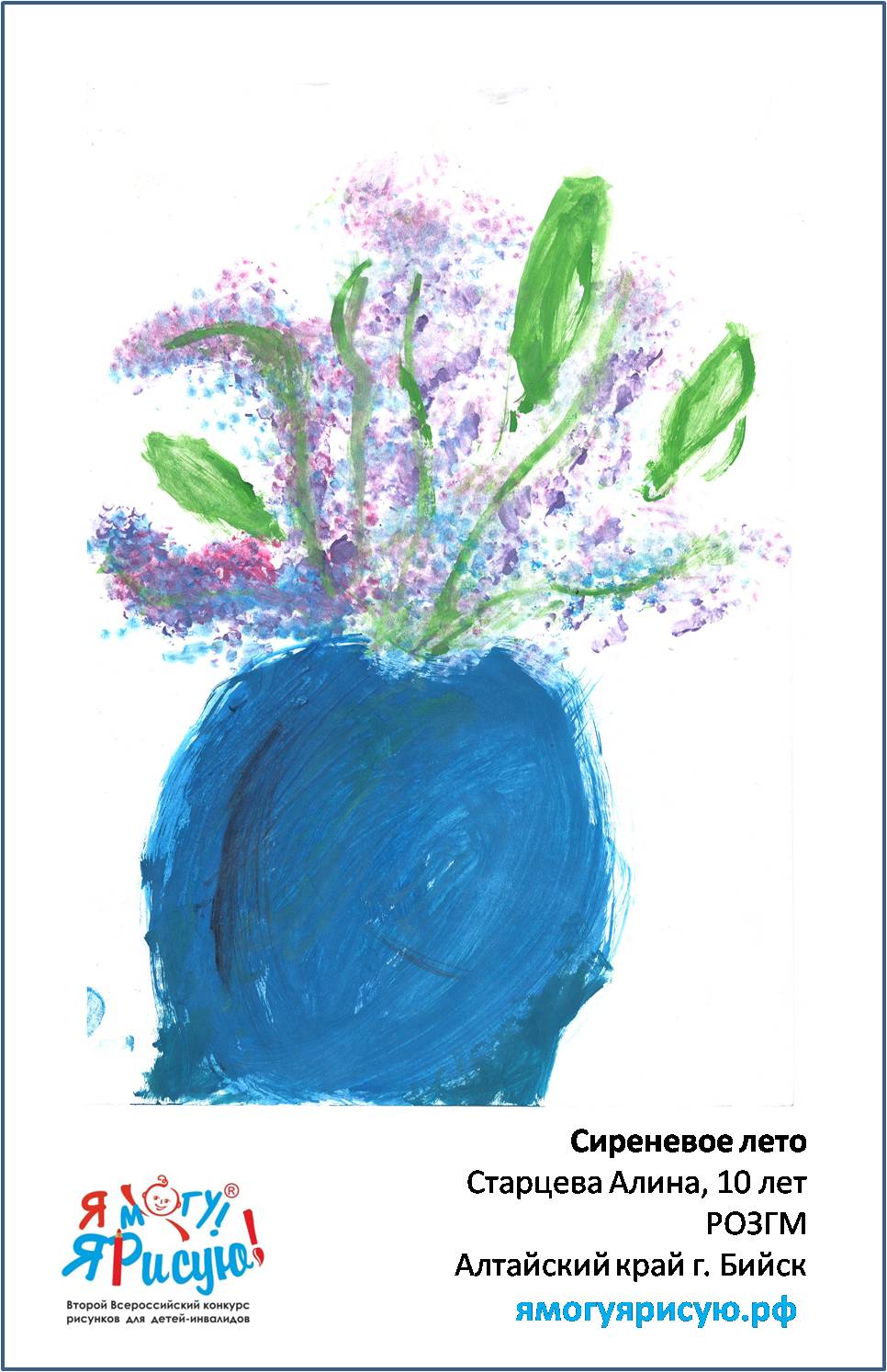 "Алина приехала в деревню к бабушке и увидела цветущий куст сирени. Она решила подарить букет бабушке и поставила его в вазу, а потом нарисовала".