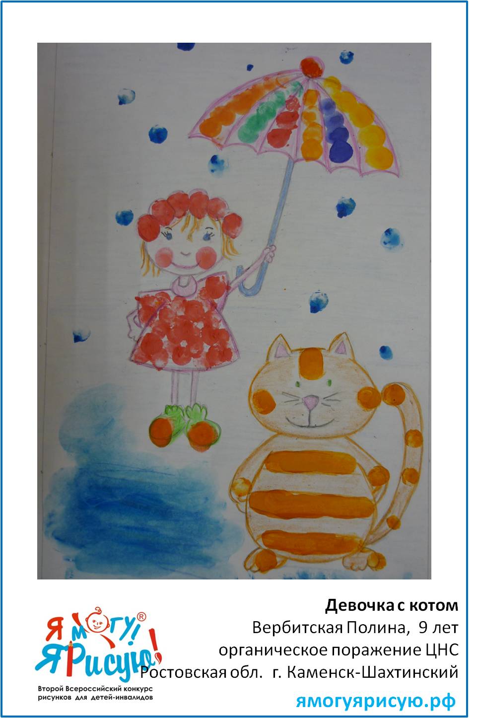 Из письма: "Полина очень любит кошек, они с мамой нарисовали портрет Полины и её любимого кота.Работа выполнена в технике пальчикового рисования."