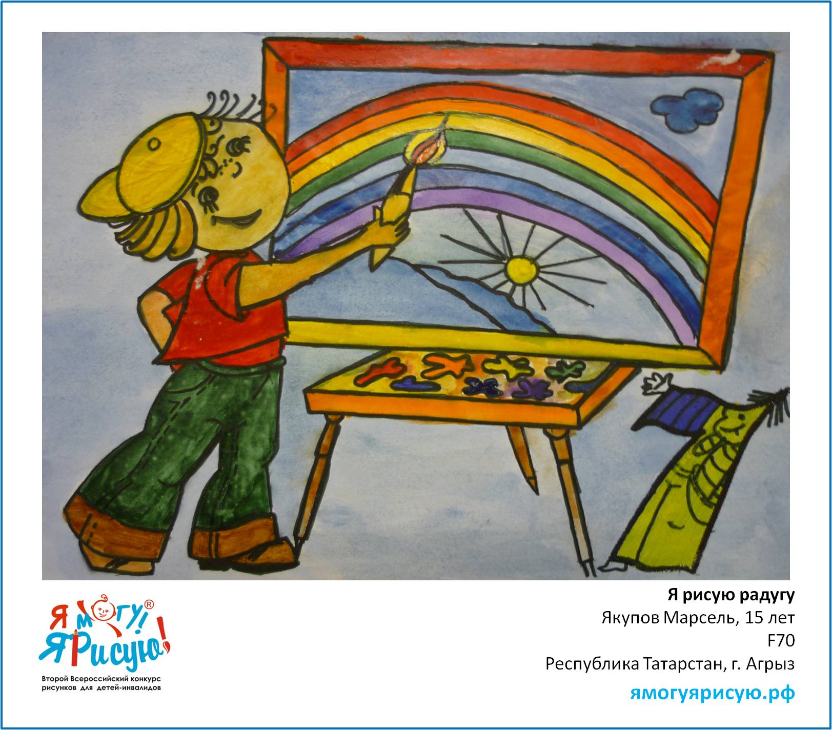 "Так как я часто путал очерёдность цветов в радуге, решил изобразить в виде рисунка. Но при этом рисовал его другой мальчик. После этого я уже не путал цвета радуги."