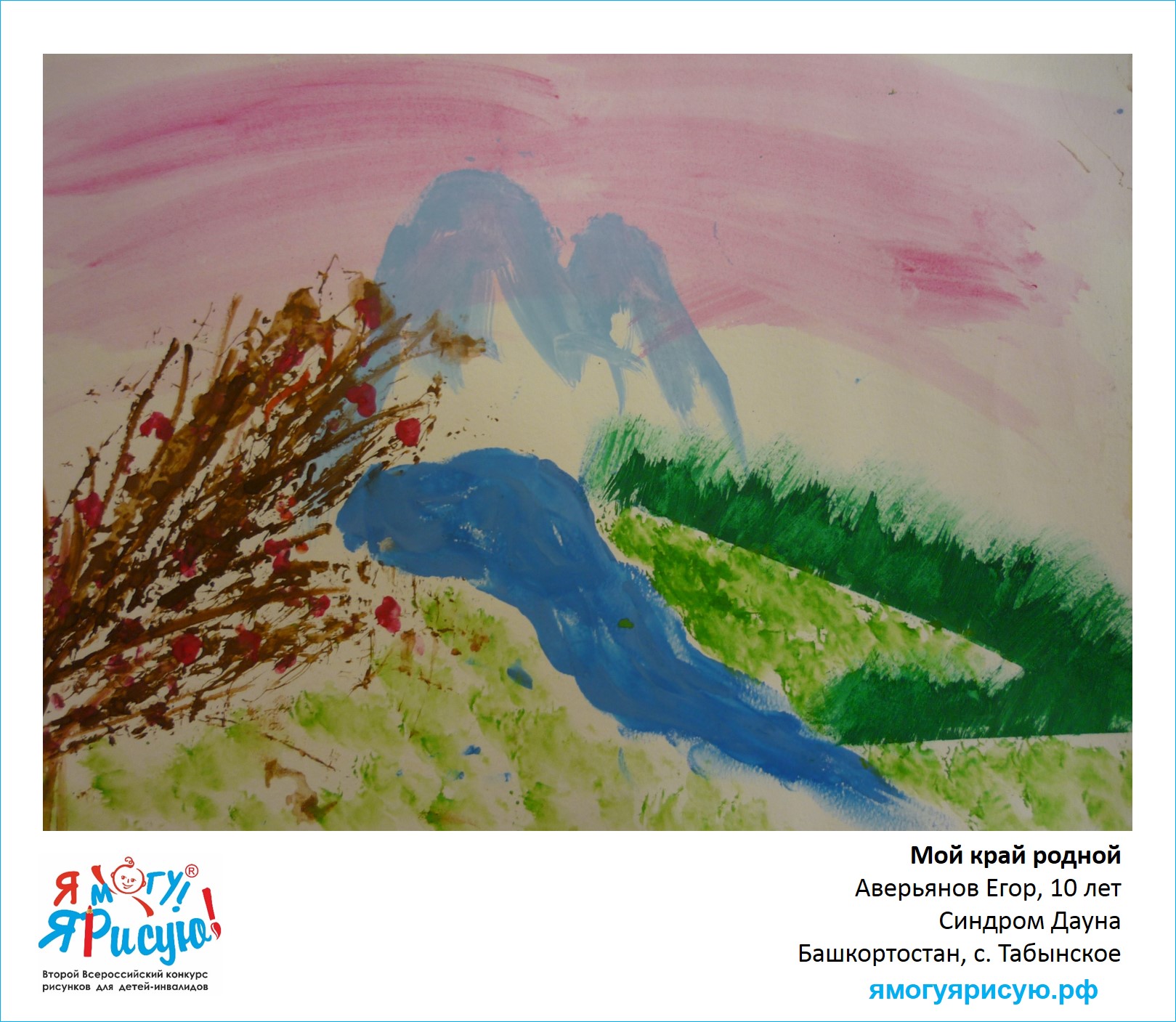 "Егор очень подвижный мальчик. Много времени вместе с мамой и младшим братом проводят на природе: на горе, на озере, в лесу. Всё это он и нарисовал. Он очень любит рисовать."
