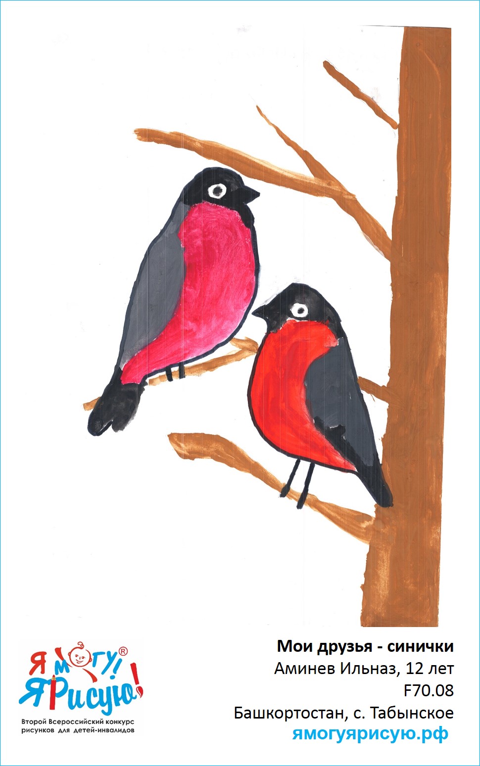 "Работа выполнена краской. У Ильназа самое любимое время года - зима. Он мечтает, чтобы скорее пришла зима, чтобы кругом было белом - бело. Он очень любит синичек. У нас в школьном саду живут зимой снегири. Дети делают кормушки и кормят их целую зиму "
