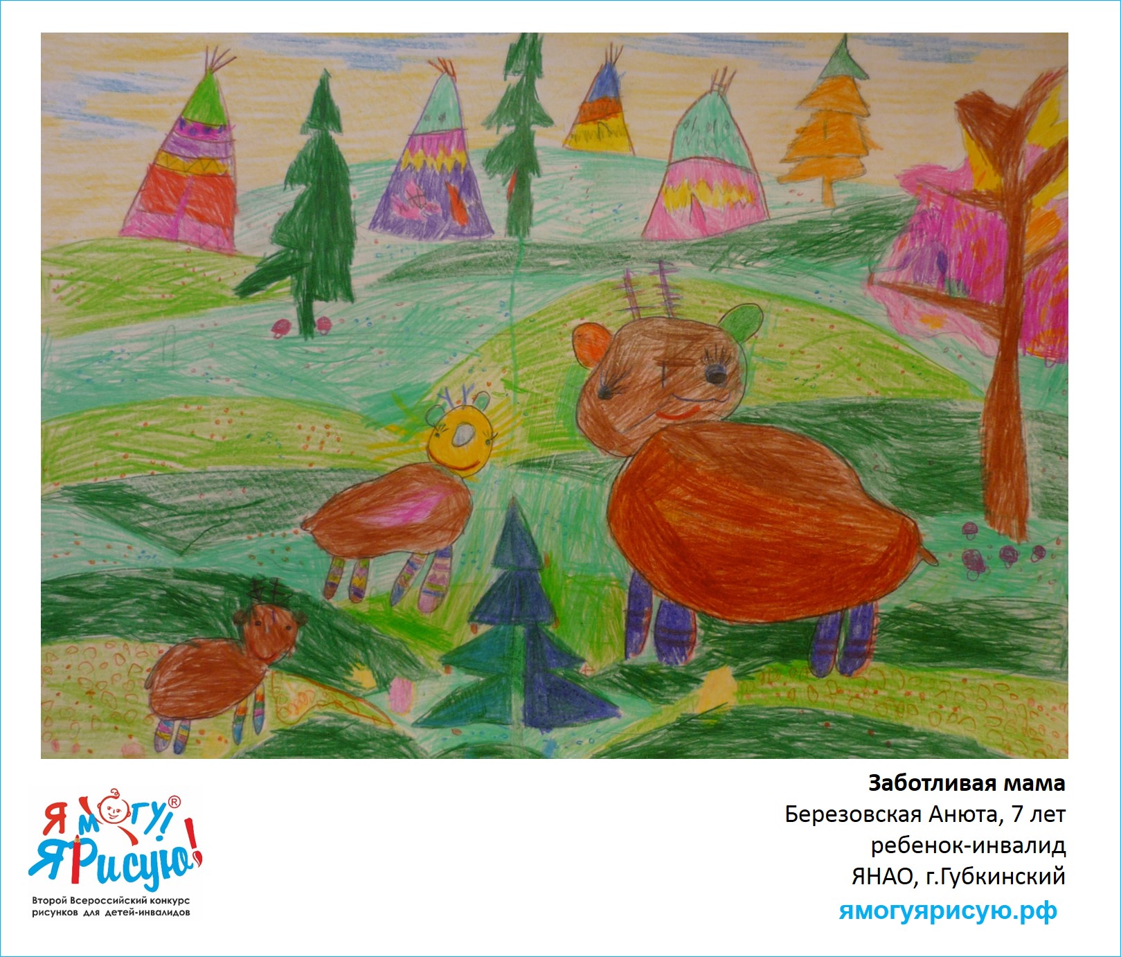 "Осенью мы собирали грибы и увидели оленят-малышей с мамой-оленихой. Мама очень заботилась о малышах, звала их, если они убегали. Мне кажется , что они были счастливы! Все мамы очень заботливые."