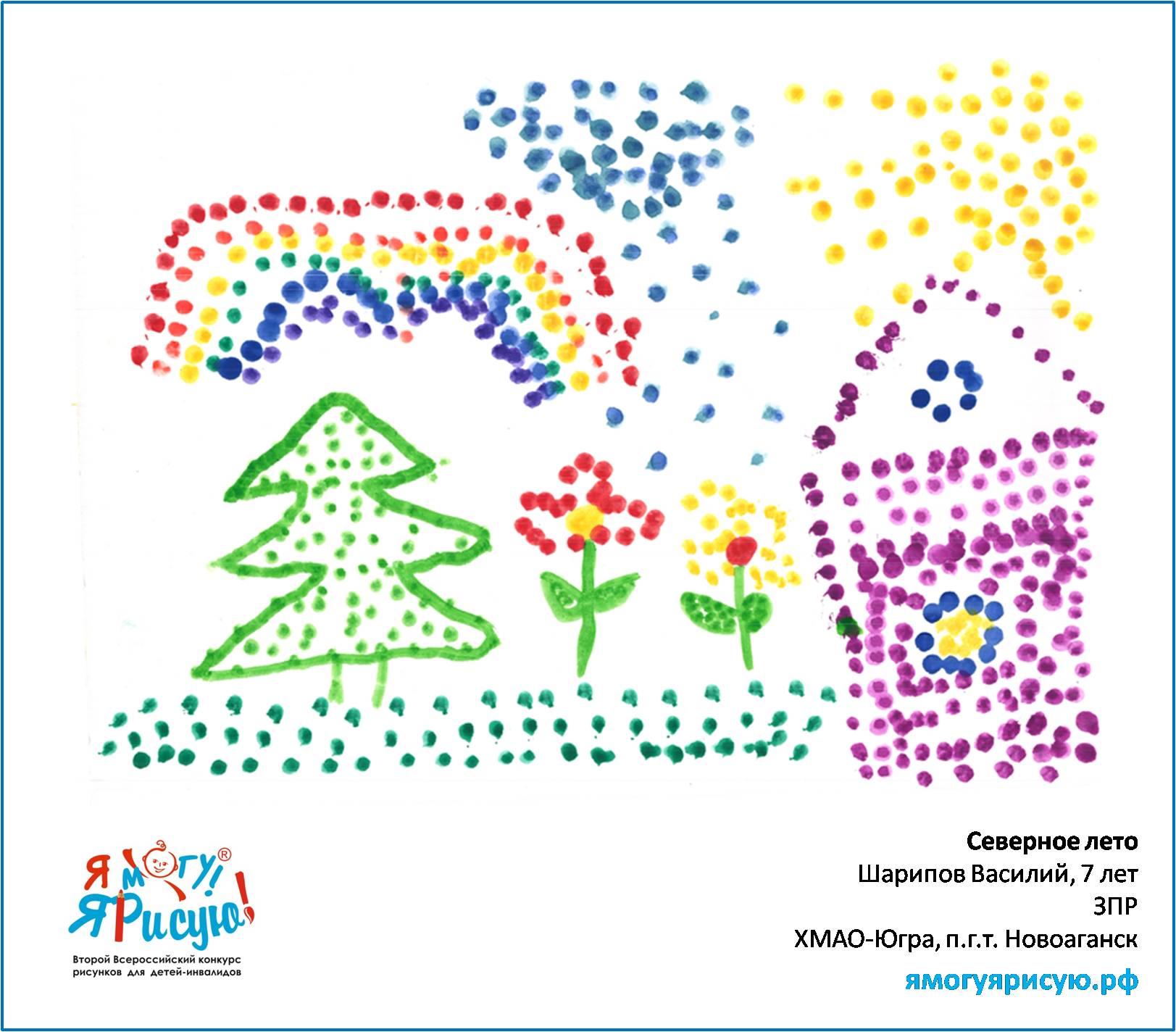 "Пуантелизм- рисование ватными палочками, акварель, в нашей местности давно наступила осень, но Вася очень любит лето и уже начал скучать по нему, поэтому решил нарисовать наше северное короткое лето"