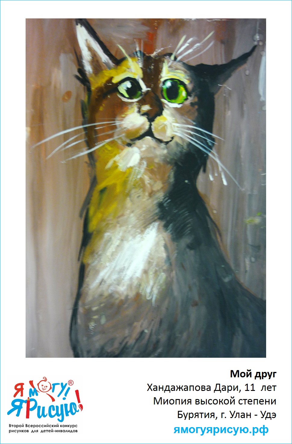 "Кошки - это моё самое любимое животное, ласковое, нежное и очаровательное. У меня есть друг Тимофей. Ах, какие у него глаза, какой взгляд! Вот и решила его нарисовать, и очень буду рада, если вам понравится!"