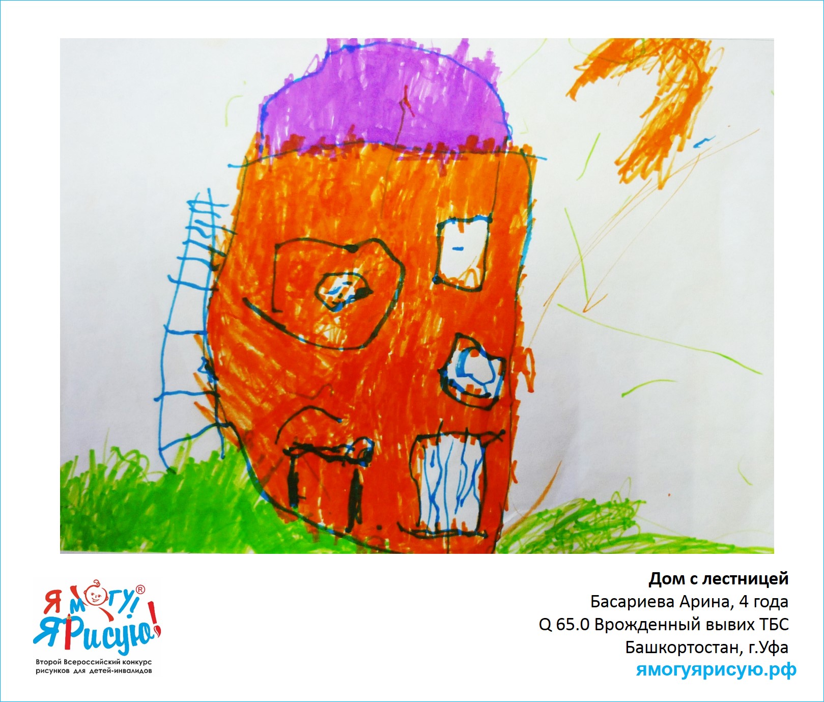 "Работа выполнена на альбоме формат А4 фломастерами. Арина рисовала данную работу лежа, после операции, по приезду домой из больницы. Она выразила свою мысль как будет самостоятельно ходить, гулять, любоваться окружающим миром. Идти только вперед к вершинам. (работа выполнена в 3г. 11 мес.)".