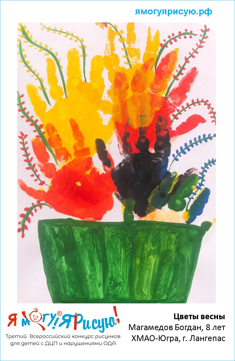 Этот рисунок Богдан создавал с улыбкой на лице, повторяя слово мама. Ребенку тяжело держать кисточку в руках в силу диагноза. Рисунок выполнен в нетрадиционной технике рисования – оттиск ладошки.
