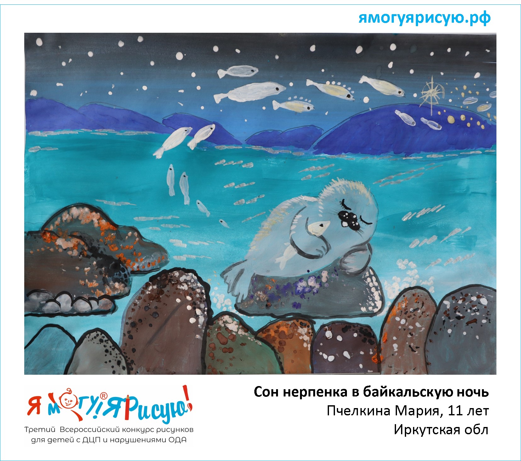 Тема выполненной конкурсной работы «Сон нерпенка в байкальскую ночь» не случайна. Маша живет в удивительном месте- рядом с прекрасным, волшебным, и во всех смыслах, неповторимым озером Байкал!