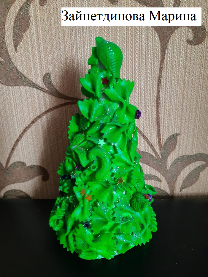 Аппликация из макарон, на конус приклеиваем мелкие макаронные изделия, наносим акриловую краску и блестки