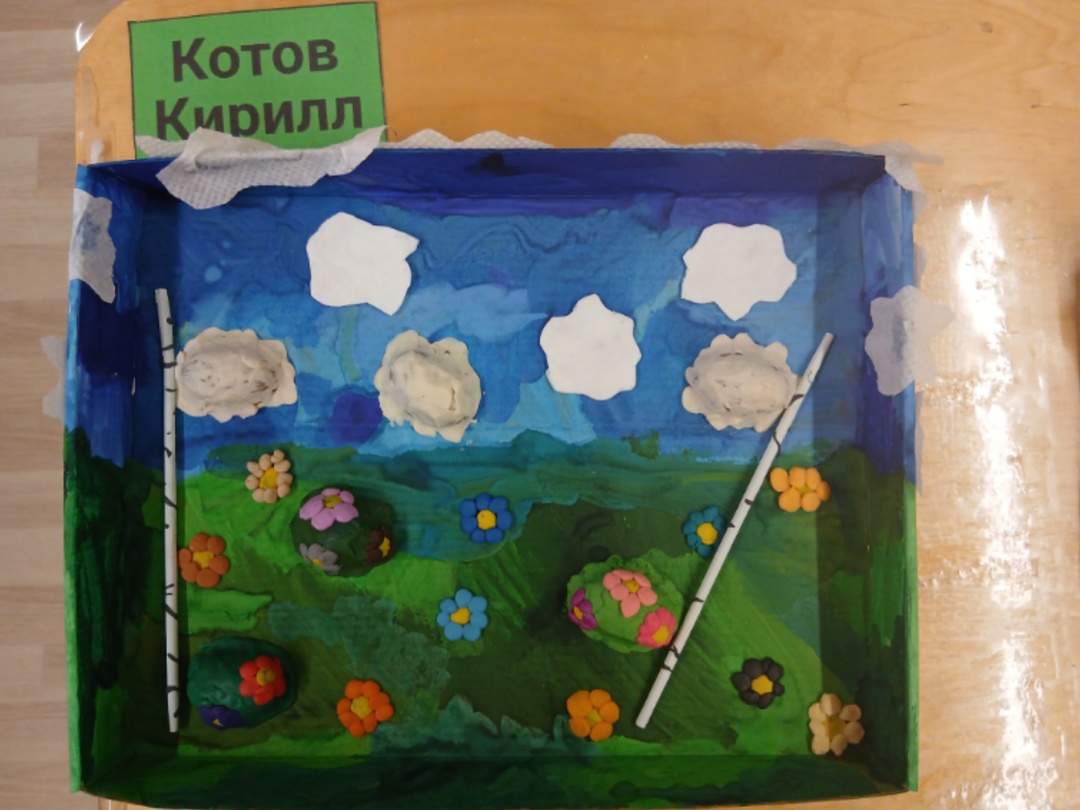 В своей работе Кирюша решил изобразить любимое время года-весну. Поделка изготовлена с использованием природных материалов (скорлупа грецких орехов), а также ватных дисков, превратившихся в облака, пластилина и даже деревянных палочек из которых вышли замечательные берёзы. Фон был нарисован гуашью"